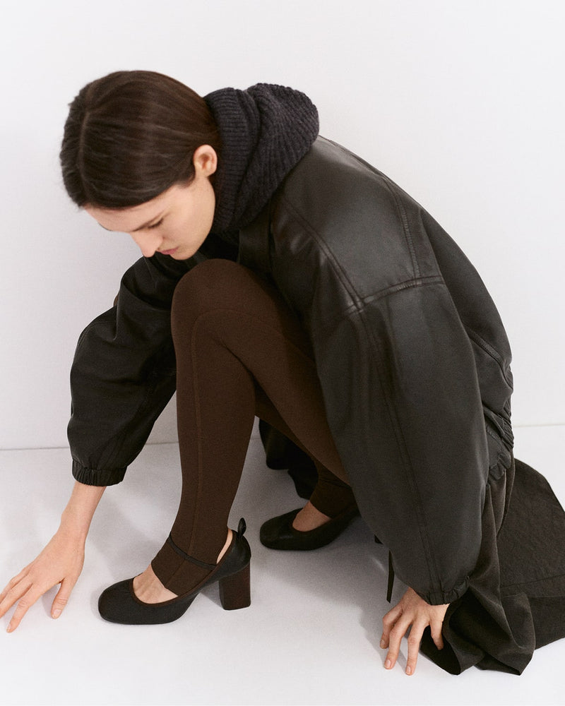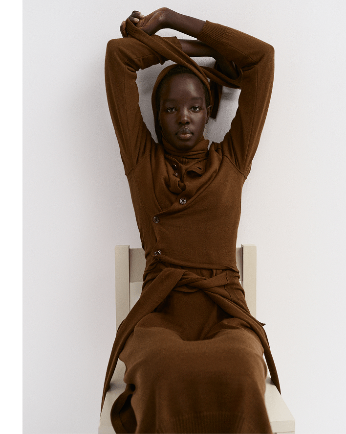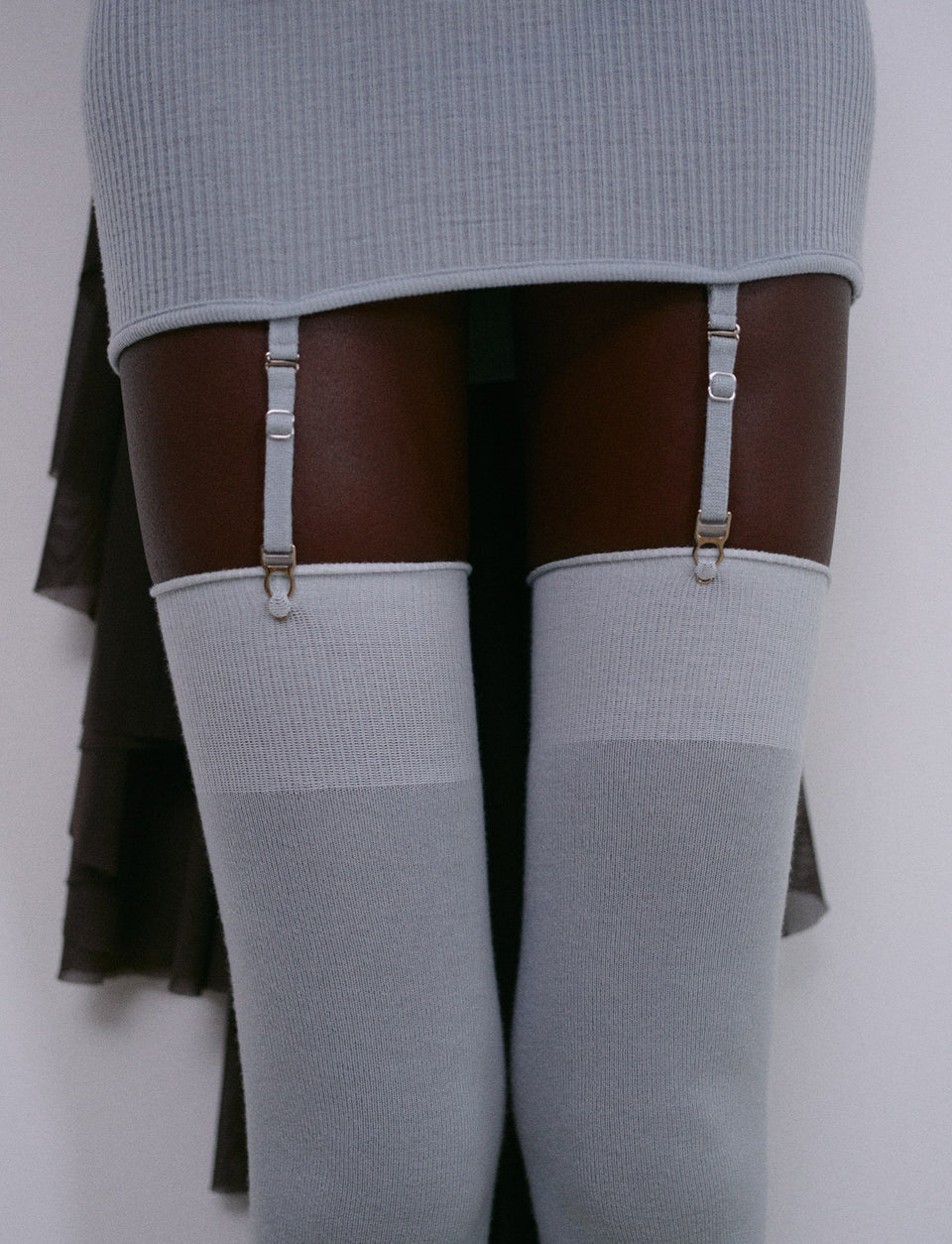Jedes Bild fängt die subtile Kunst des Layerings ein und hebt hervor, wie sich diese zarten Kleidungsstücke – ein langärmeliger Body aus feiner Viskose-Seide, ein Trompe-l’œil-Rock aus einer sanften Merino-Mischung – mit leichter Transparenz und stiller Sinnlichkeit um den Körper legen.