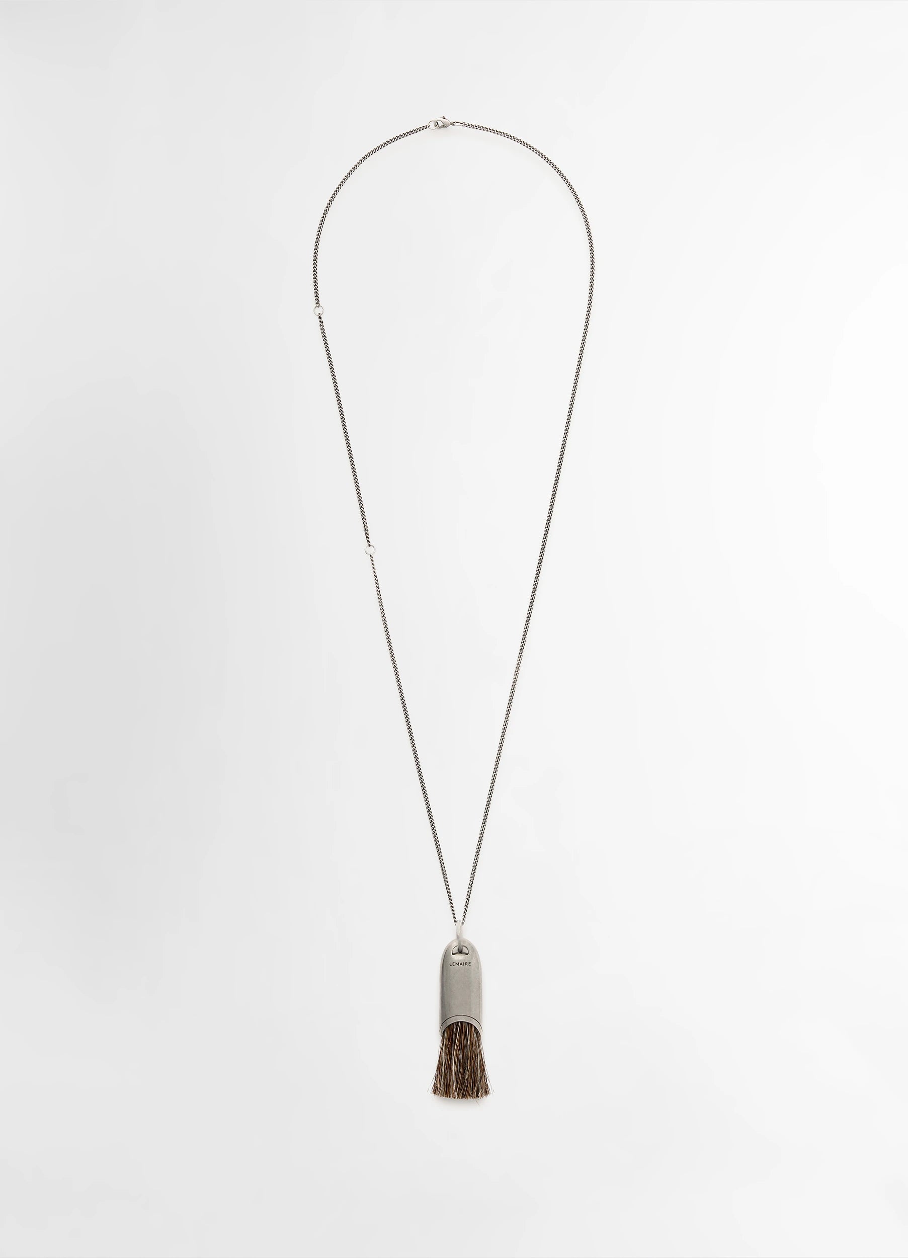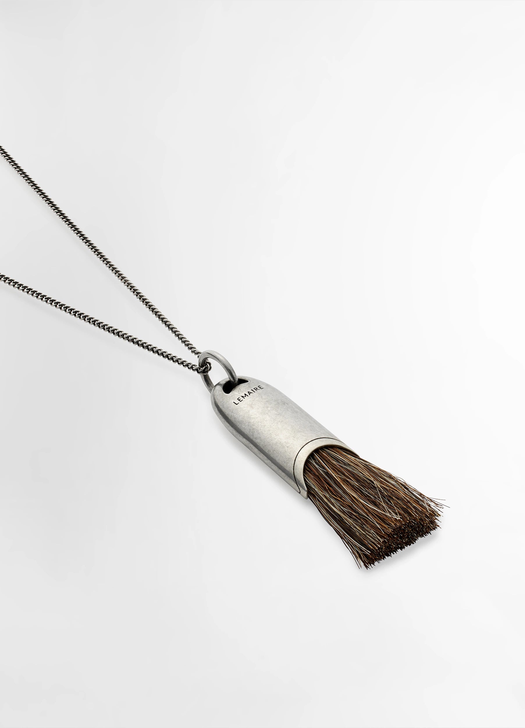 Lemaire Personal Brush Necklace in Silver and Brown Brush, product shot, Front view Pendant with brush