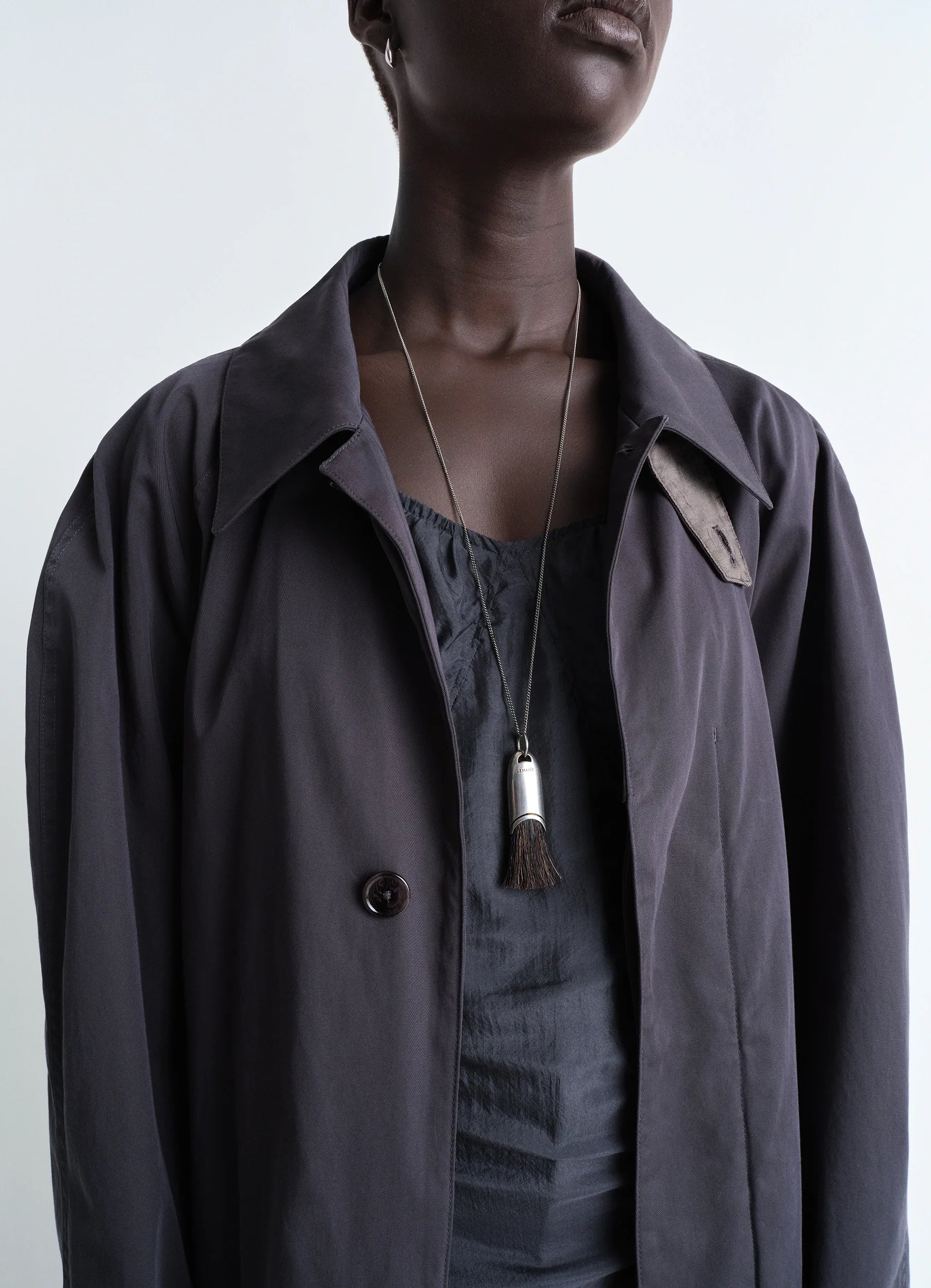 Inspiré par l’esprit du cabinet de curiosité, ce collier avec pendentif brosse personnelle s’inscrit entre l’objet et le bijoux, une frontière chère à Lemaire.