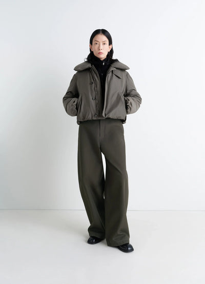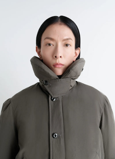 Ce blouson court matelassé est rembourré de plumes et garantit une sensation de légèreté et de chaleur. Confectionné en mélange de lin et coton avec un traitement déperlant, ce tissu confère à cette pièce une fonction technique de protection contre les éléments.