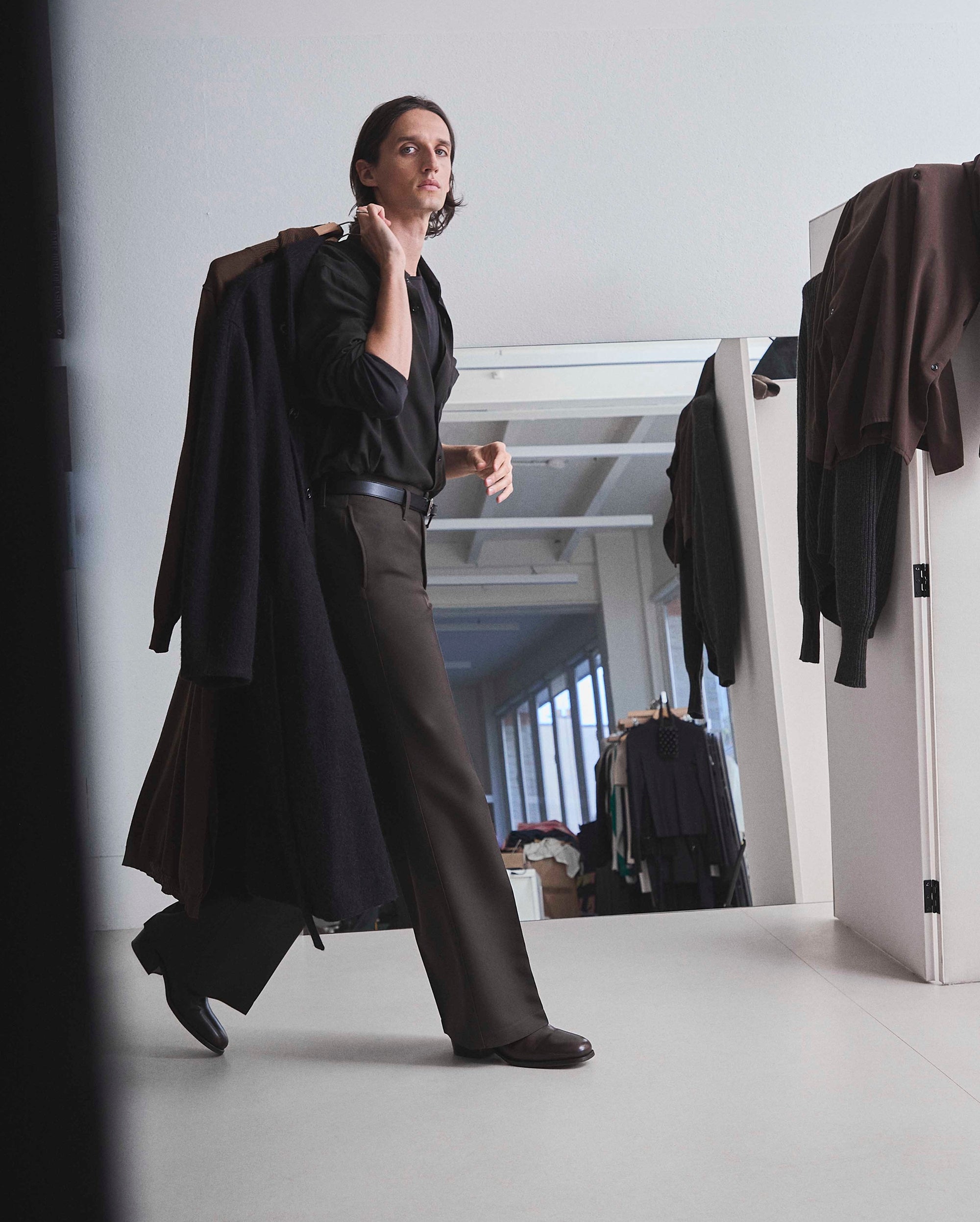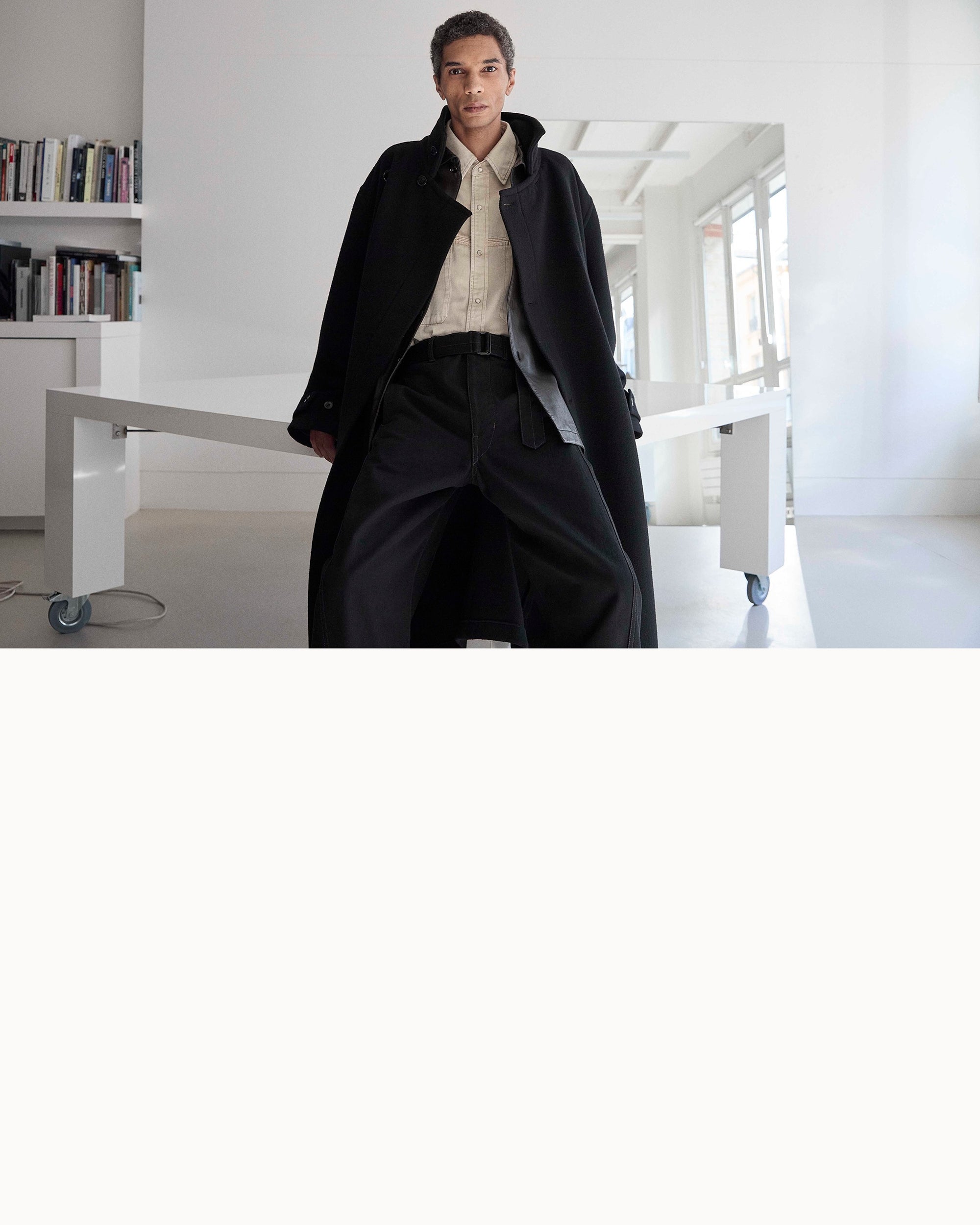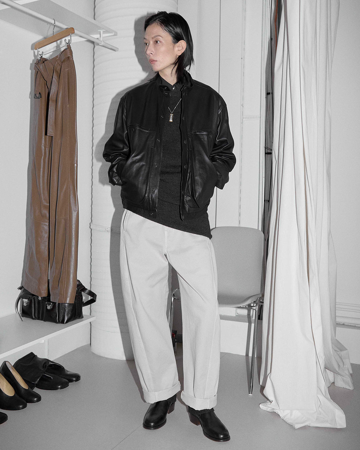 スタイリスト、デザイナー、モデルといったファッション業界に携わる人々が、クラシックなデニム、ウール、レザーで構成されたルメールのワードローブを着用します。大胆にボリュームをもたせたアシンメトリーなフィット、コントラストステッチのラップコート、カーブしたトラウザーズが、体の輪郭を優美に演出します。ヤン、ジュリア、シンユー、フィリップのシルエットは、ルメールのスタジオ、アトリエ、オフィスがあるヴォージュ広場11番地で撮影されました。