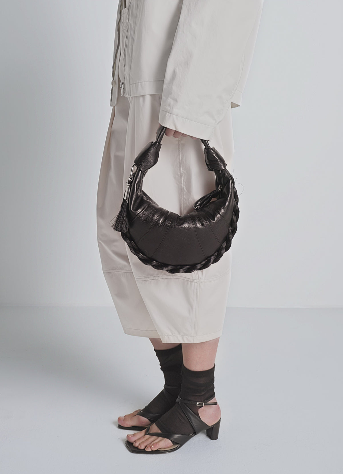 午年を祝し、ルメールは馬毛を中心としたクラフツマンシップを探求することで、中国の春節を称えます。象徴的なクロワッサンラインからインスピレーションを得た「フォーチュン クロワッサン」バッグは、手持ちでも肩掛けでも使える新しいシルエットです。折り畳まれた半月型のフォルムは、トップステッチを施したパネルを組み合わせ、結び目のディテールで彩られています。このミニバージョンは、スタッズ付きのナッパレザーで仕立てられています。柔らかくしなやかな素材で、認定タンナーによる滑らかで質感のある手触りが特徴です。