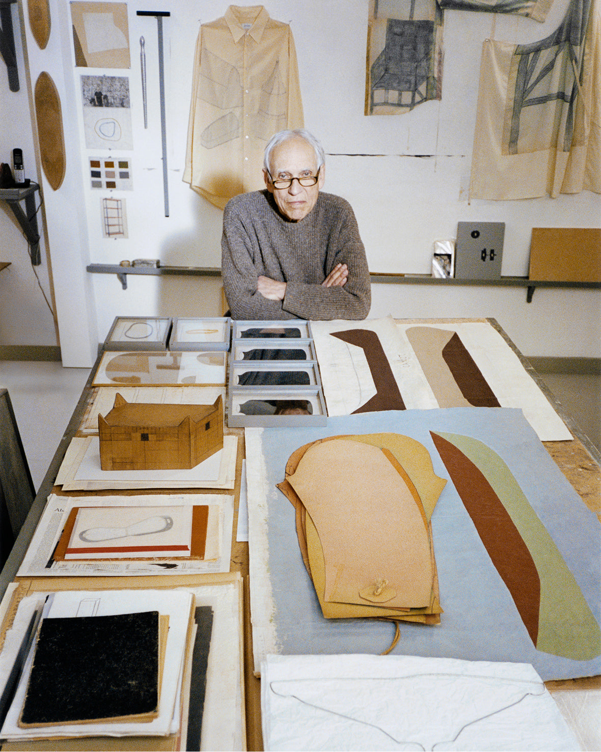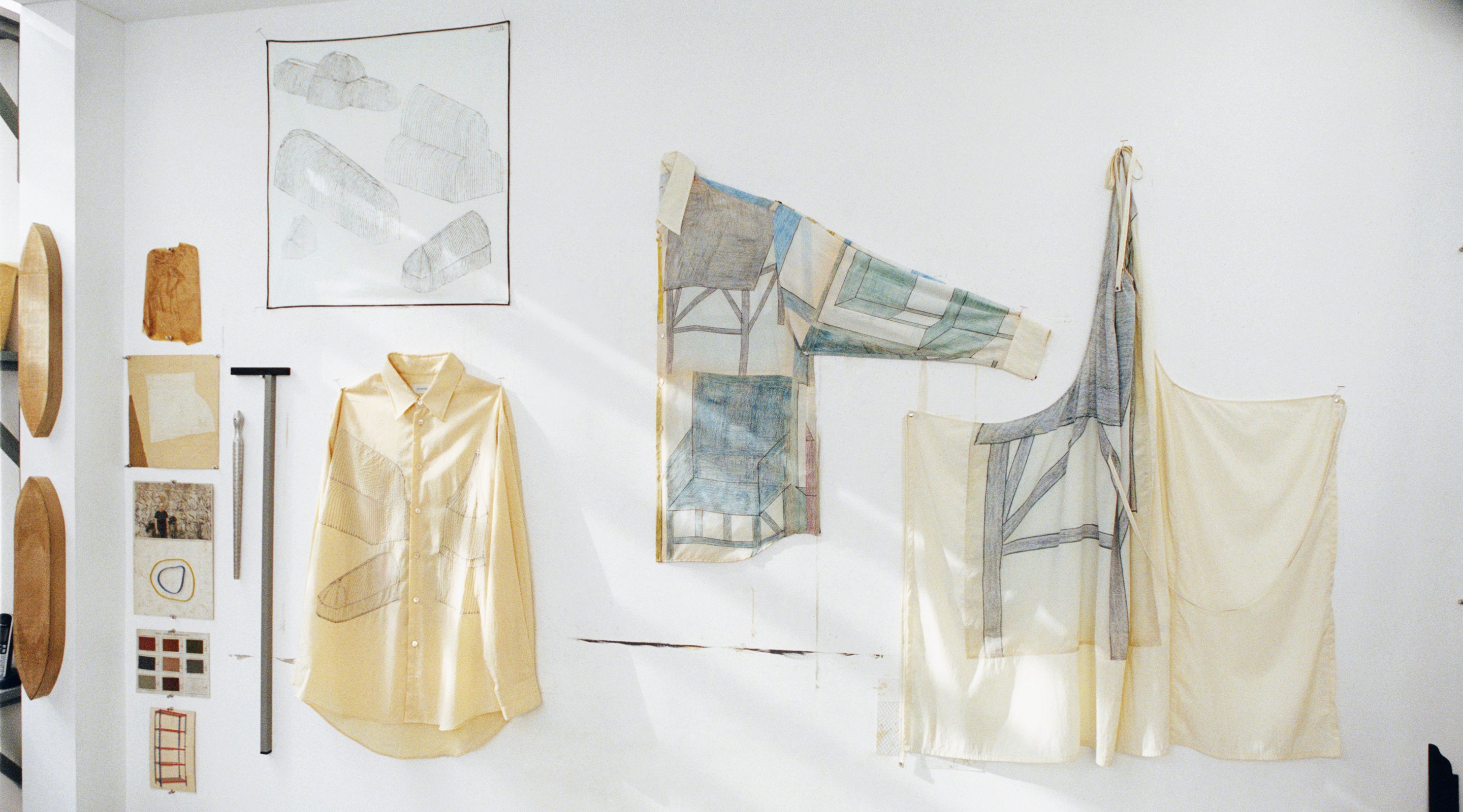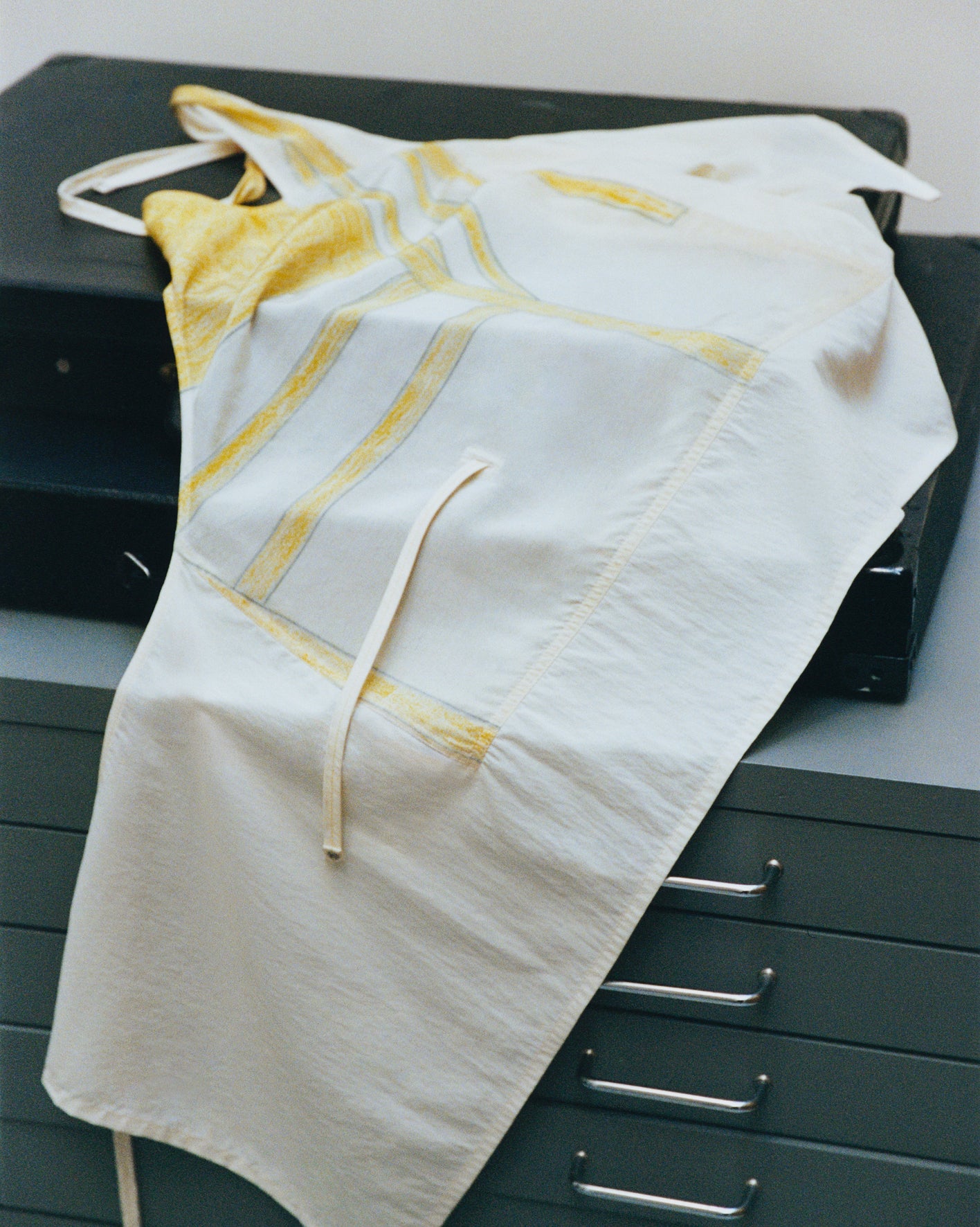 The collection reflects his muted colour palette of pastels, browns, greys, and blacks, often rendered in light materials with subtle transparencies.Prints and fabric inlays echo his flat colour fields, while thread embroidery replicates his meticulous line work.Specific garments are informed by Weisbecker’s workspace and tools, including apron tops and dresses, relaxed shirts, polo tops, and hobo bags. The collaboration embodies a shared appreciation for objects that endure the passage of time and celebrates the lyricism of the everyday.