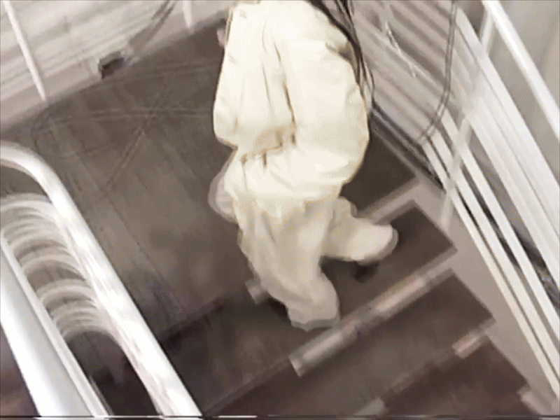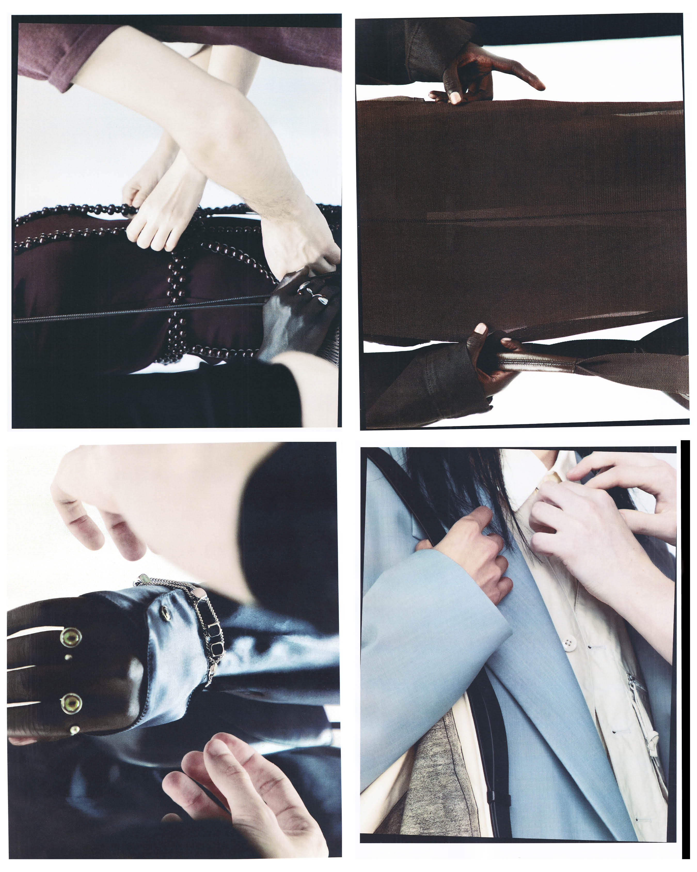 Hands move with purposeful energy, carefully draping and tying strings and materials, buttoning, layering, structuring, and adjusting the silhouettes.