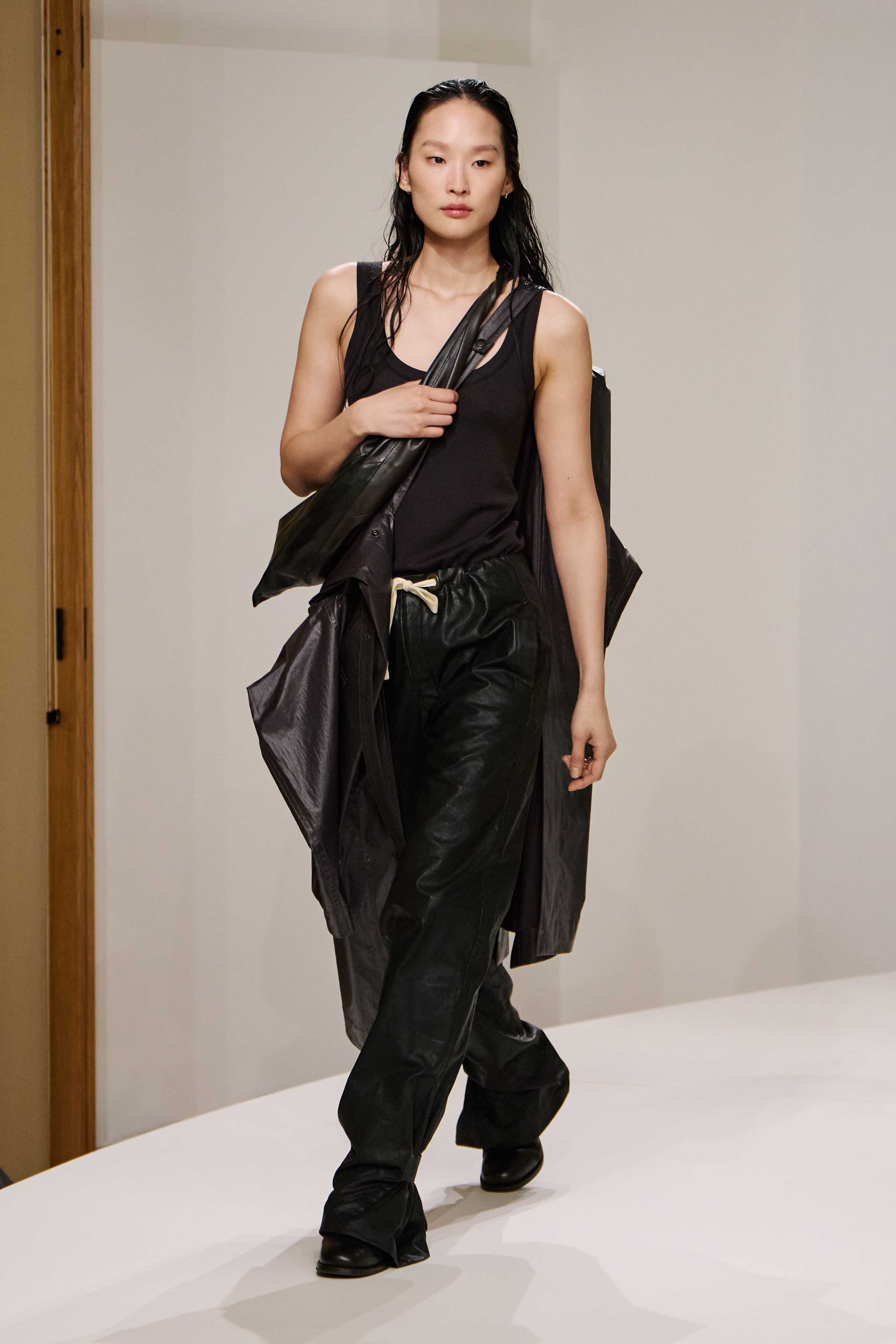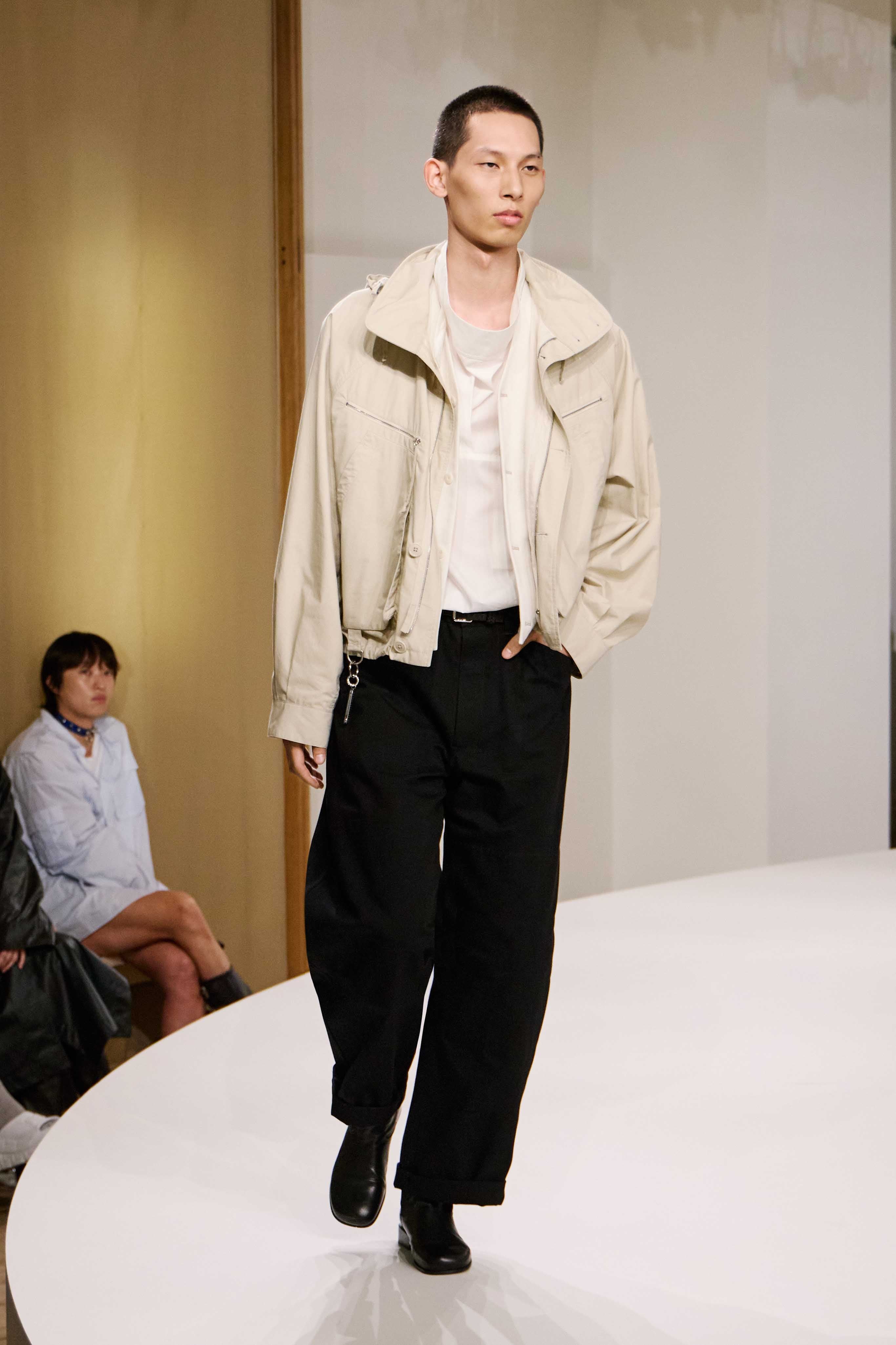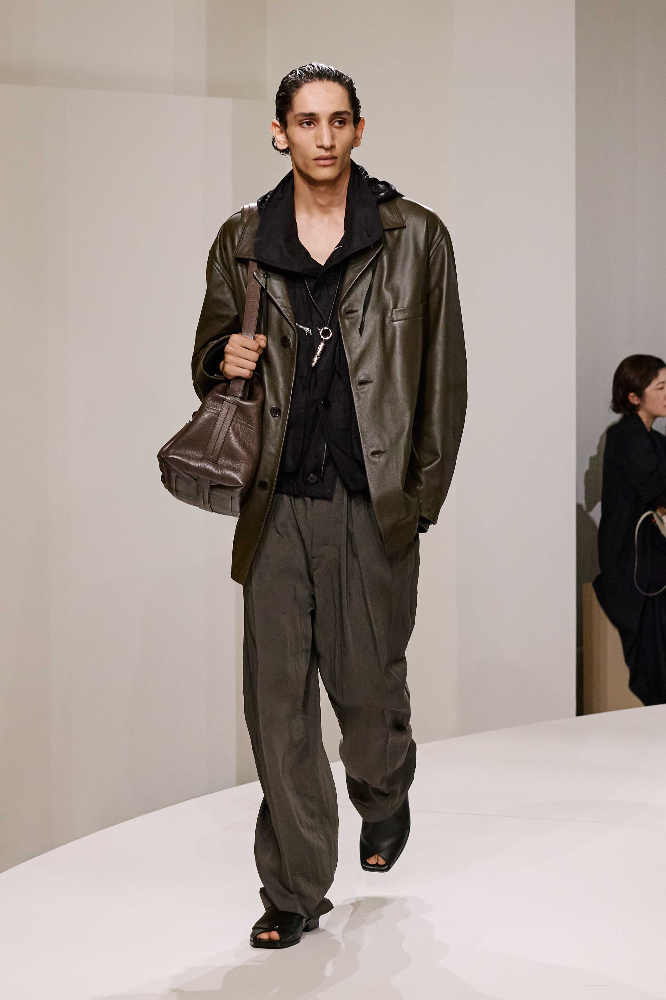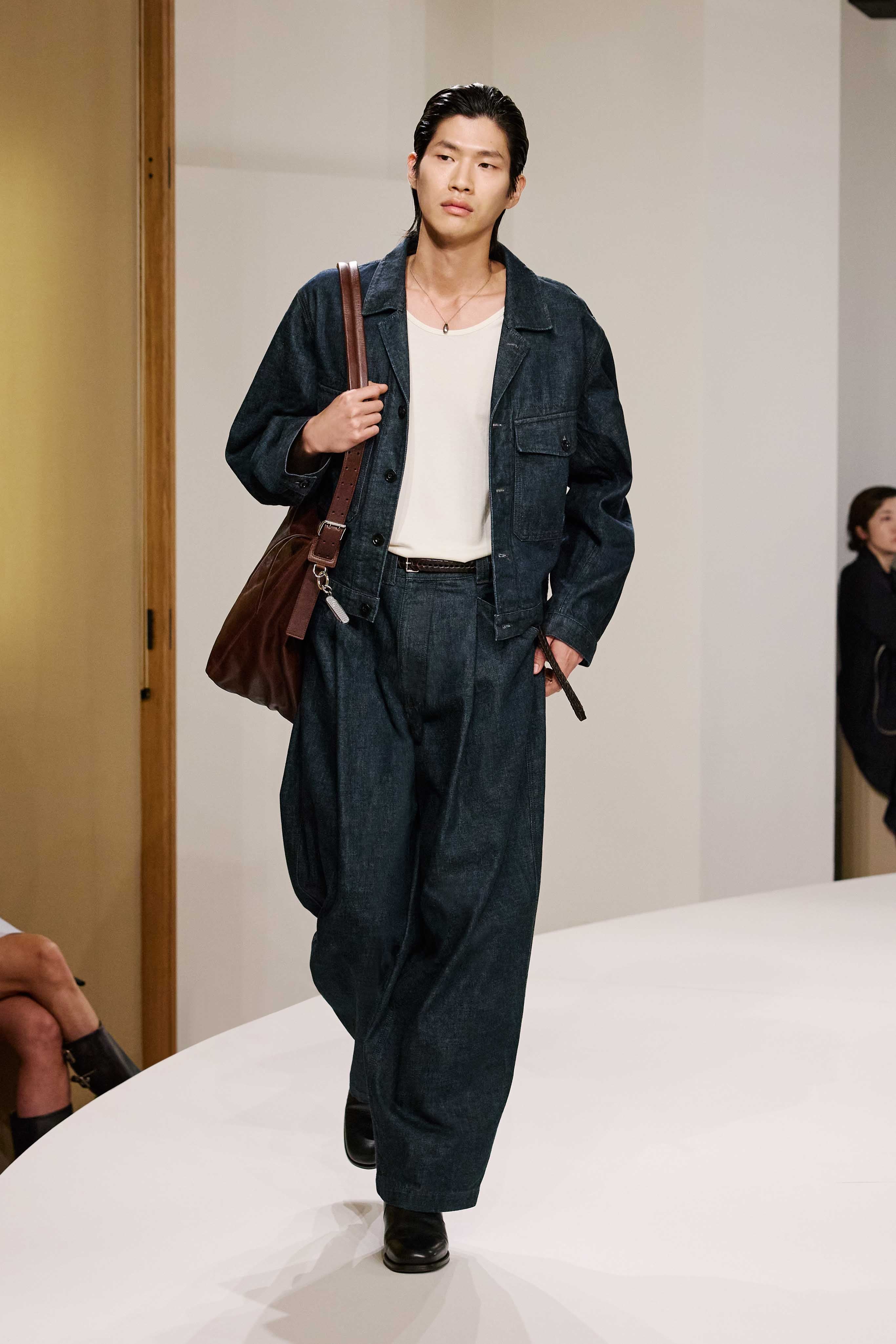 One can find some of the themes that run through the LEMAIRE wardrobe: soft tailoring revisited in light, supple fabrics, workwear imagined in refined materials, loose-fitting cuts following fitted lines, and slender attitudes that enrich the wardrobe with a new sensuality.