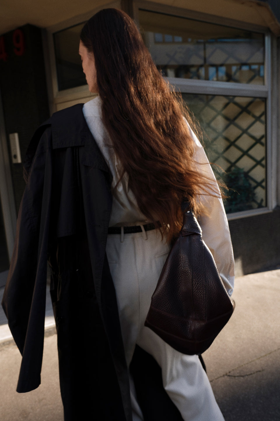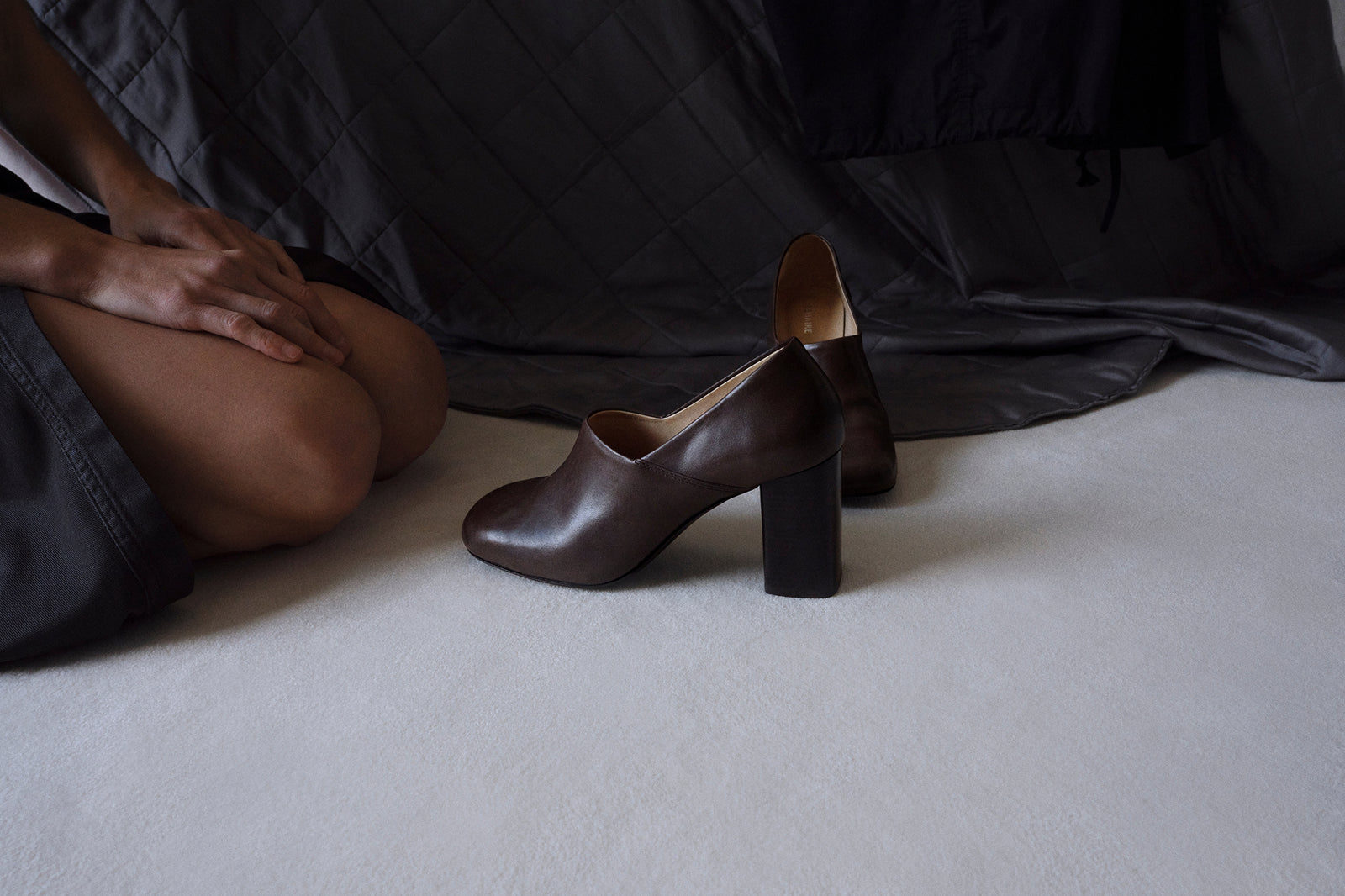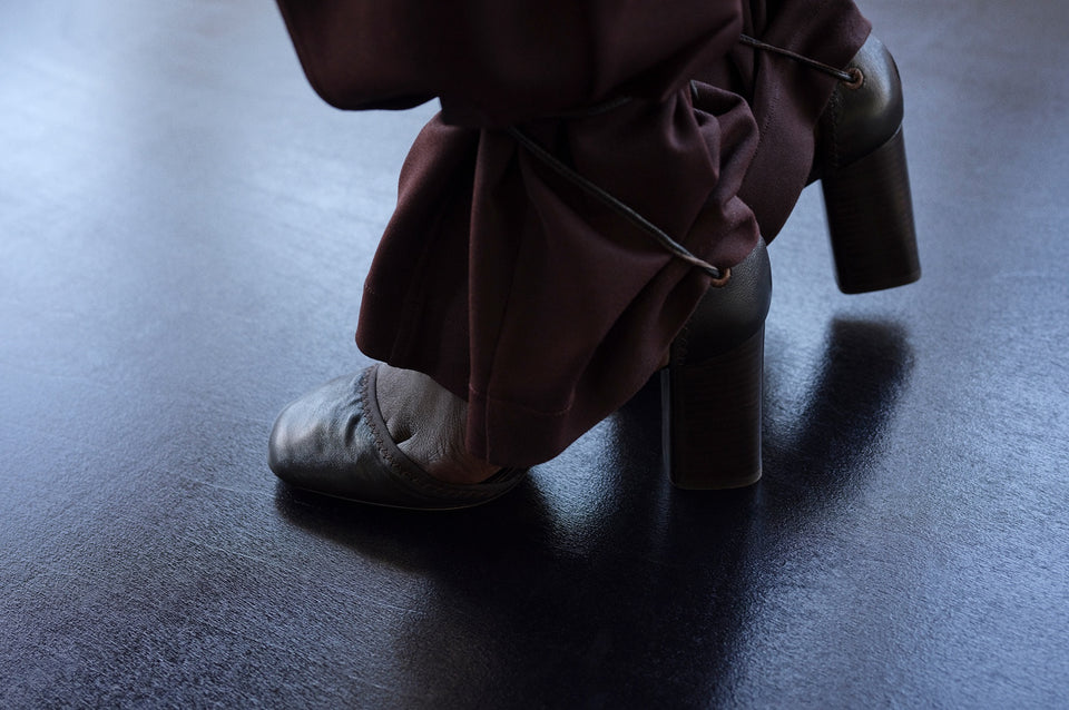 Pieces from the collection are photographed during brief moments of action, introspection, and repose in the lives of the protagonists. Strong silhouettes and tailoring juxtapose the luminous textures of satin cotton, mirrored viscose, and molded leather. Metallic details shine in a deep, monochromatic palette and the soft, filtered light.