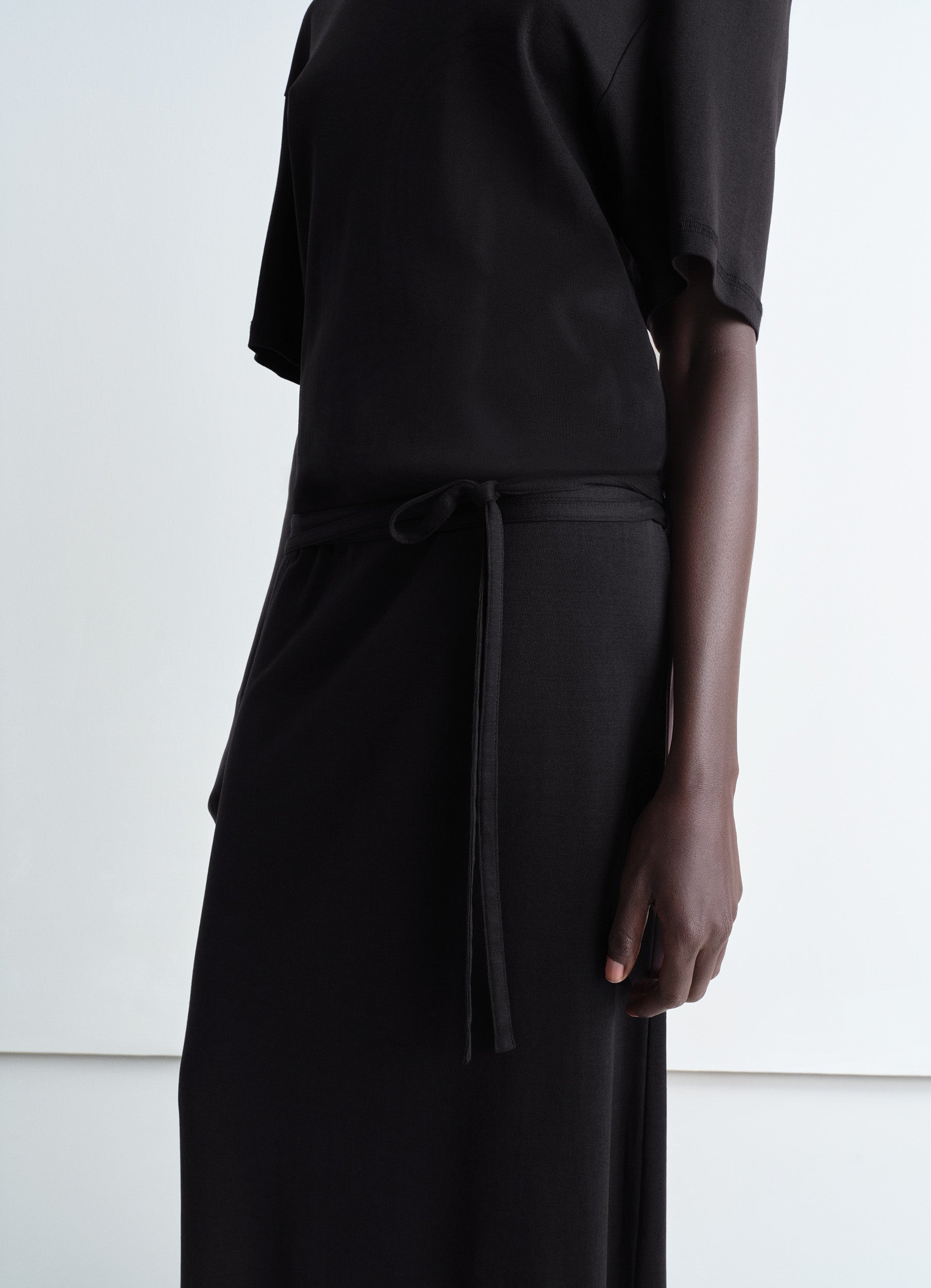 This Belted Rib T-shirt Dress is a staple of LEMAIRE’s feminine wardrobe. It is made of a mid-weight cotton jersey woven into a soft, flexible rib with a textured quality. The loose, ankle-length shape features an open round neck and rounded shoulders. Details include a ribbed collar, flat shoulder seams and a removable matching belt - long enough to be belted several times around the waist.