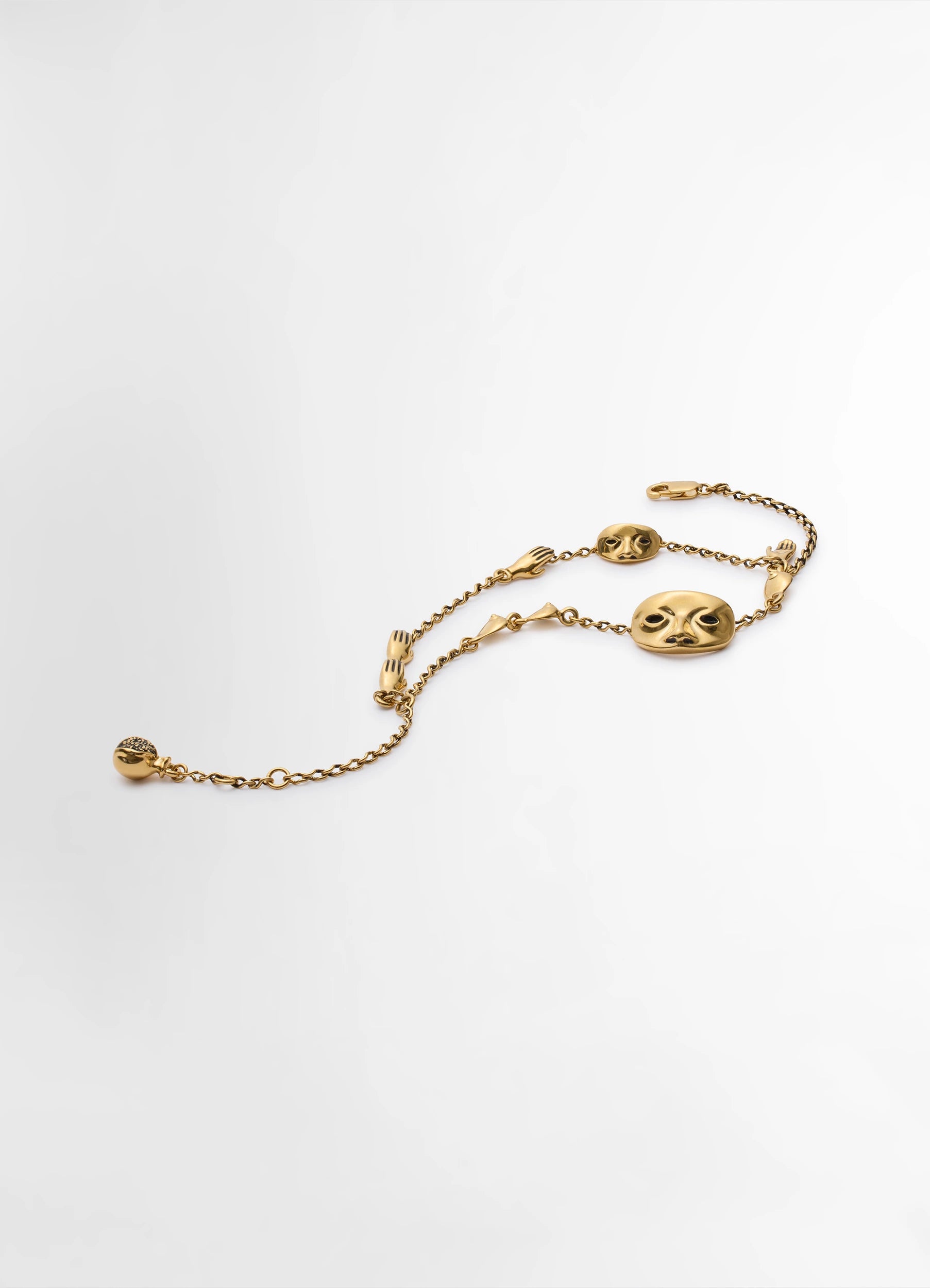 Inspired by ex-voto and the traditional art of metal engraving, the Estampe line features delicate figurative forms such as hands, hearts, pomegranates and masks. This bracelet is made of aged-effect gold-plated brass.