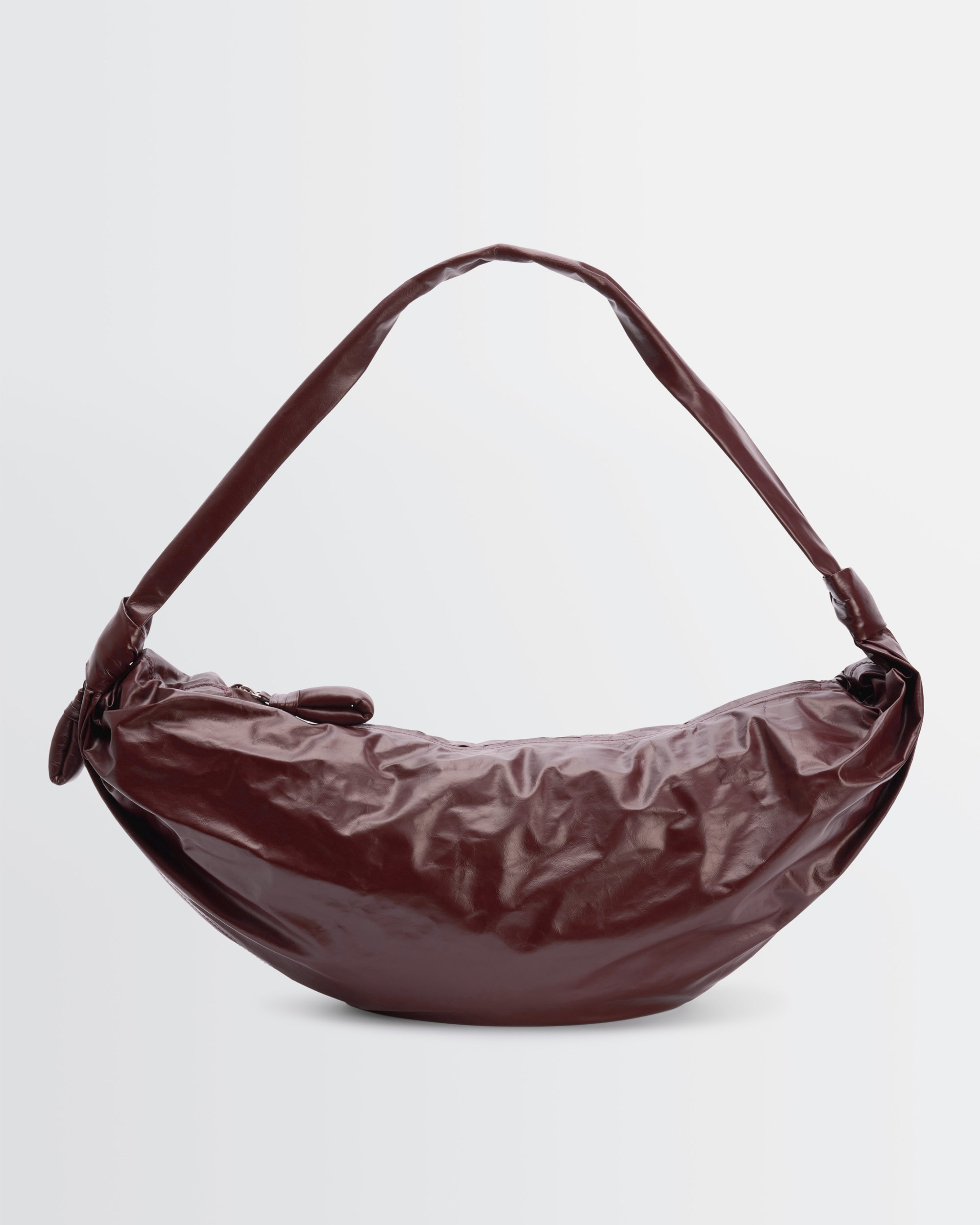 The Croissant line is emblematic of the Lemaire wardrobe. This versatile bag features a curve inspired by the viennoiserie of the same name, created in the Soft version by side pleats and knotted elements. This large bag is made of paper-effect leather, a light, resistant material characterized by its shiny appearance, certified LWG Gold.