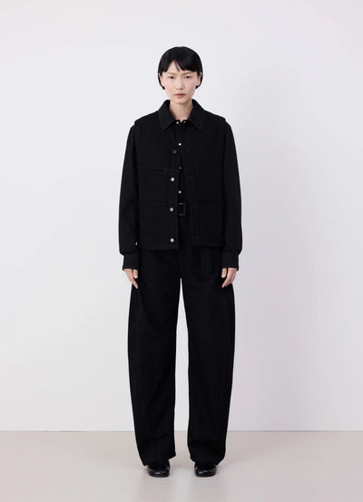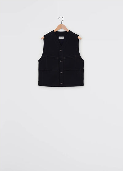 This Sleeveless Gilet debuts this season in the feminine LEMAIRE vestiaire. It is made of a denim with a visible twill weave and a deep black wash. Multiple contrast stitching run along the lines of this utility-inspired V-neck silhouette closing with four denim-style metal buttons. There are six front pockets at the front and waist adjusters at the back. This straight-fit piece can be layered over a shirt or under a jacket.