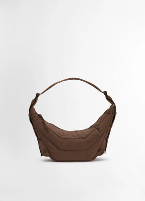 This unisex bag is part of the Soft Game bag family. The Small Soft Game is made of a slightly fluffy-nylon canvas treated with a water-repellent finish - GRS certified. Its wadded fabric gives the bag a matte surface and a sturdy structure which holds its shape over time. Inspired by the Croissant bag, it is lightweight yet functional thanks to its padded adjustable strap and its interior zipped pocket. It has the capacity for accessories such as a smartphone or a 4x7-inch book. On both sides of the bag, embroidered eyelets and laces allow its volume to be adapted. Ideal for daily use, this style can be worn as a shoulder or a cross-body bag.